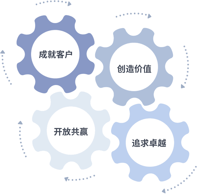 成就客户是一切决策的出发点,,创造价值是衡量所有工作的标准,,,追求卓越是我们做事做人的态度,,开放共赢是我们的格局也是最终的结果。。价值观的齿轮环环相扣,,,,推动着组织里的每个人不断向前。。